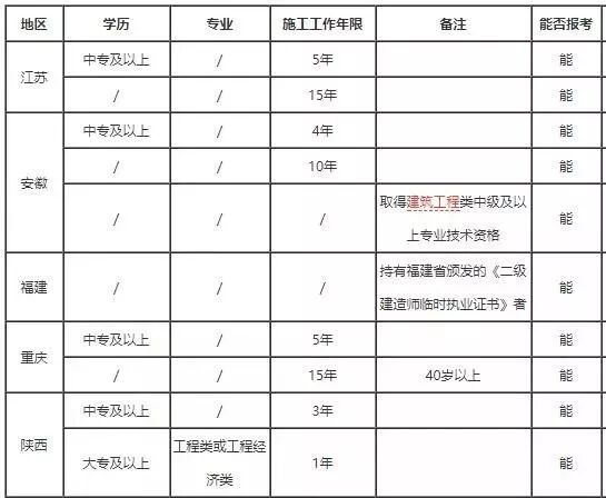 但从近几年开始,不少省份已经放宽了二级建造师报考条件。陕西、江苏、福建、河北、山东和安徽放宽了对学历和专业的要求。重庆和浙江的考生在学历或者专业达不到标准的情况下,满足一定施工工作年限或其他条件也能报考。