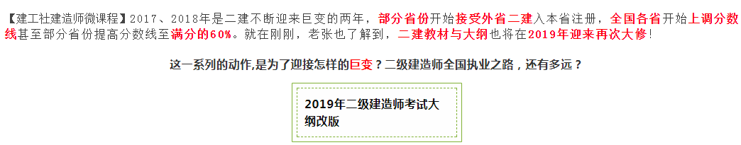 2017、2018年是二建不断迎来巨变的两年,部分省份开始接受外省二建入本省注册,全国各省开始上调分数线甚至部分省份提高分数线至满分的60%。就在刚刚,老张也了解到,二建教材与大纲也将在2019年迎来再次大修!