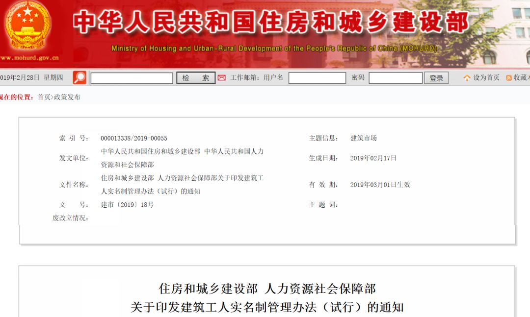 重磅!住建部发布建筑工人实名制管理办法,3月1日施行!发布时间:2019-03-01 浏览:968 次